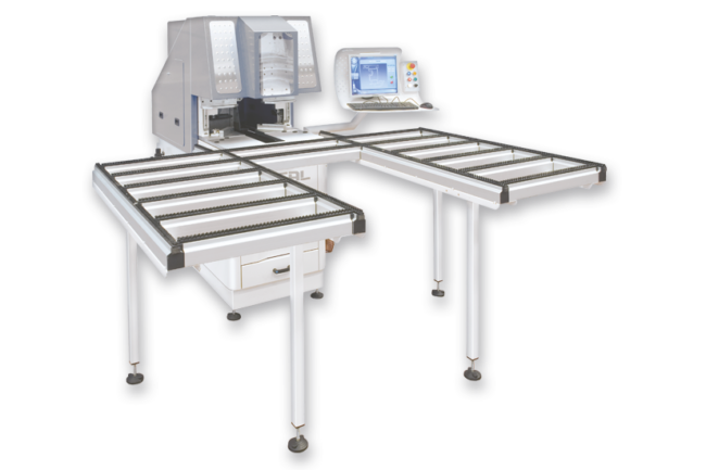 Ebavureuse d’angle automatique à 2 axes contrôlés par une CNC, pour l’usinage de profilés en PVC soudés en angles de 90°. Sur la partie supérieur du coulisseau porte‐outils peuvent être montés 2 lames ou fraises, 4 porte couteaux ( couteaux d’onglets ou ciseaux), 1 outils à rainurer. Sur la partie inférieur du coulisseau porte‐outils peuvent être montés 4 porte couteaux (couteaux d’onglets ou ciseaux), 1 outils à rainurer.